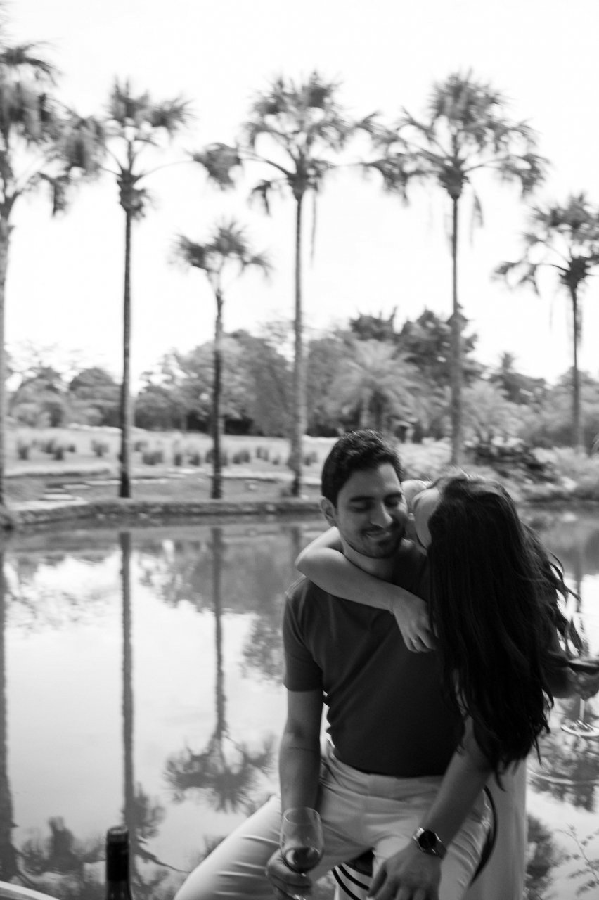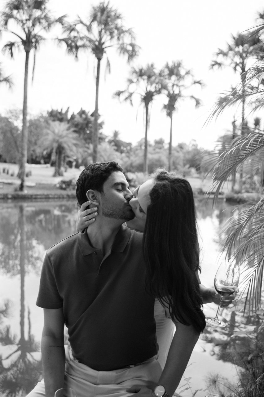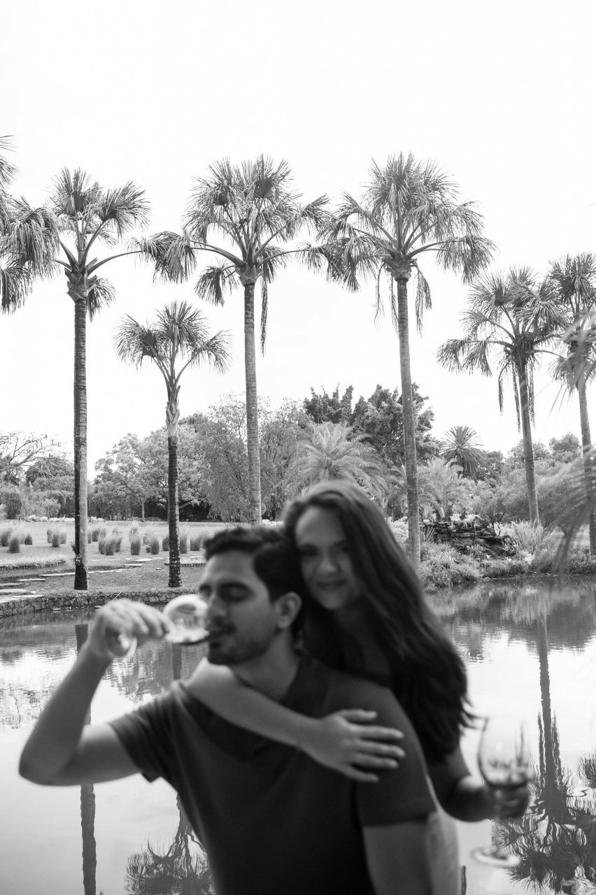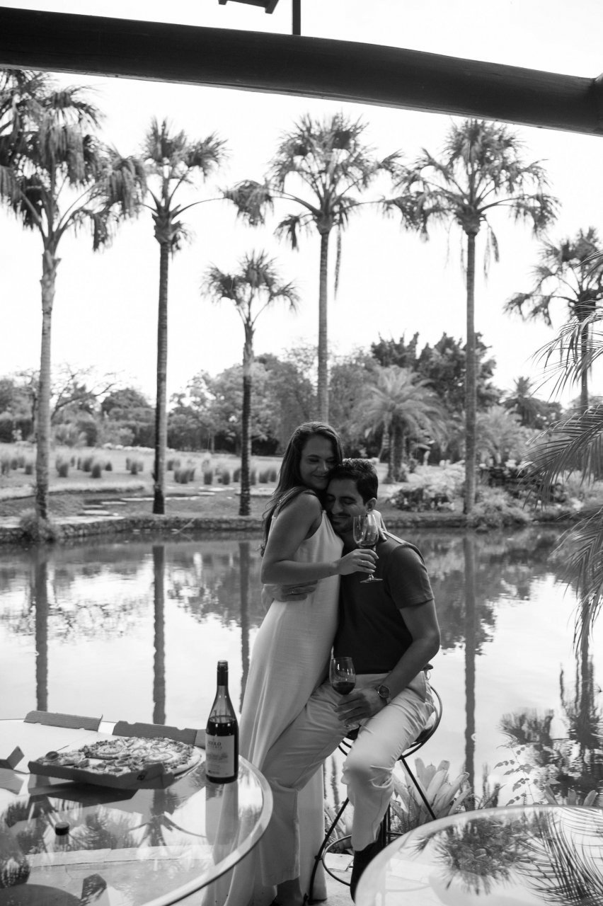 Guilherme e Thainá iniciaram o namoro às margens do lago Paranoá, sob a luz do ocaso do dia 07/08/2018. Ali, o tempo pareceu ceder, como se concedesse um intervalo para que o amor, finalmente, se anunciasse ao mundo. Vieram então os anos, e com eles, as primeiras conquistas. As viagens que expandem o mundo e a pandemia que o encolhe. Terminaram a faculdade lado a lado, enfrentaram juntos o medo, a insegurança, o tédio e o recomeço. Mudaram de casas, de rotinas, de si mesmos. Em cada mudança, aprenderam a permanecer. O amor, esse ser curioso, não se deixou quebrar. Ao contrário: cresceu nas rachaduras, fez morada no cotidiano, resistiu às pressas e às distâncias. Com o tempo, aprendeu a falar baixo, a se sustentar nas coisas simples. O café dividido, a risada cúmplice, o silêncio que não pesa. E quando alguém os via juntos, percebia sem precisar dizer: eram dois que haviam aprendido o segredo de ficar. O amor chegou sem alarde, e sem alarde ficou. Ficou, como quem sabe que já pertence.